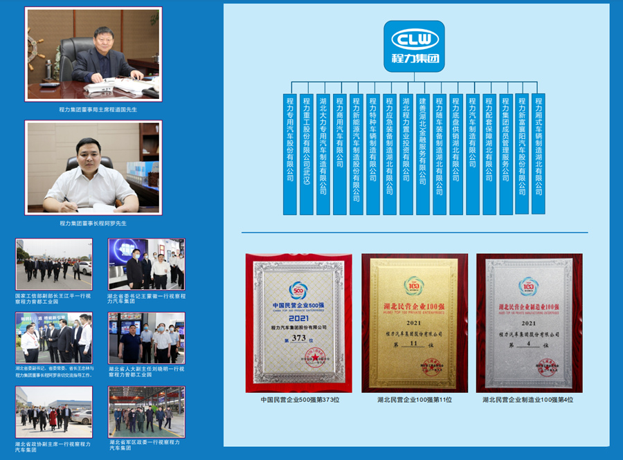 集团核心企业“程力专用汽车股份有限公司”以品种多、资质全、生产设备先进、检测手段完备等特点,成为中国专汽龙头企业;“程力商用汽车有限公司”拥有先进的商用车生产线,满足微、轻、中、重卡汽车底盘生产需求;“程力重工股份有限公司”是中国高端专用车制造典范企业;“程力应急装备制造湖北有限公司”是应急产业装备的创新企业,生产的各类抢险救援车型具有国内领先水平。 集团已取得全国工业产品生产许可证、ISO 9001:2015质量管理、ISO 14001:2015环境管理、ISO 45001:2018职业健康安全管理等体系认证、3C强制性认证、汽车节能环保认证,汽车免征认证,美国机械工程师阿斯米(ASME)认证、欧盟协议ADR认证。拥有专用汽车、随车起重机、汽车吊、消防车、新能源汽车、汽车整车、客车等生产资质。 集团自主创新产品获得100多个国家专利。“程力威”、“大力”商标获得“湖北省著名商标”、“湖北省名牌”、“中国驰名商标”,共有2000多个品种上国家公告目录。产品畅销全国29个省市自治区,并出口50多个国家和地区,其中环卫车和轻型专用车销量连续多年稳居全国榜首。