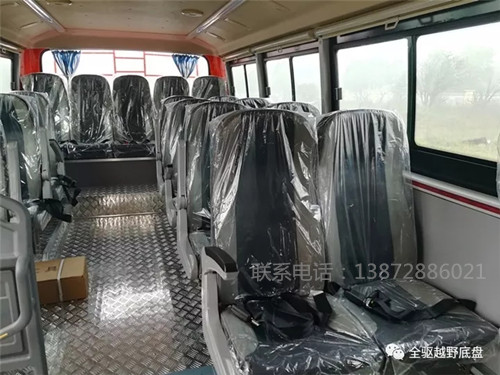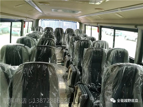 2、简化内饰带窗帘,带换气安全天窗、前风挡手动遮阳帘、中门后乘客座椅前设置防护栏,地板为铝制花纹板材,驾驶员座椅高档减震座椅(可前后位移、上下高度、水平角度、靠背角度均可调节),乘客座椅为仿皮普通座椅(固定不可调节),可调式扶手。