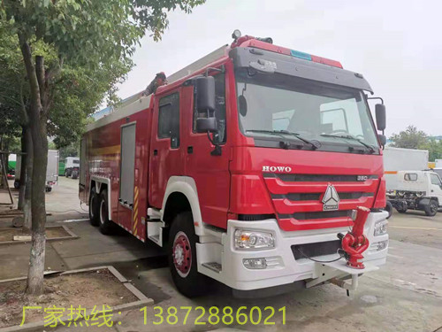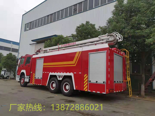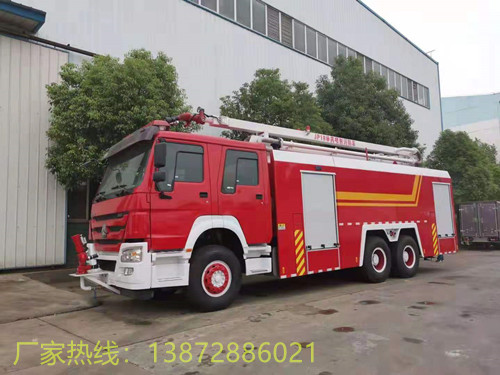 车型概述 重汽豪沃举高喷射消防车是我厂采用重汽原装底盘ZZ5347V4647E1基础上改装而成,整车结构紧凑;专用部分由操纵台、供水系统、电气系统、液压系统、折叠伸缩臂、电动遥控消防炮等组成,主要用于高层建筑以及石油化工装置、油罐、仓库等高大建筑物的火灾扑救,消防队员可通过电动遥控消防炮在高空中从多个角度灵活地喷雾、喷水或者喷射泡沫进行扑救一般性火灾,是理想的消防装备。。 整车型号 18米举高喷射消防车 底盘型号 ZZ5347V4647E1 质量参数 (kg) **总质量(kg) 31700 外形尺寸(mm) 10690×2500×3970 额定装载质量(kg) 12020 罐体容积(mm) 11.6m3 整车整备质量(kg) 19230 轴 距 (mm) 4325+1350 发动机 参 数 型号 D10.34-50 排 放 柴油 功率/排量(kw/ml) 247/9726 生产企业 中国重型汽车集团有限公司 性能参数 **车速(km/h) 90 轮距(mm) 前 桥 2022 驾驶室 2+4 后 桥 1830 钢板弹簧 10/12 悬长(mm) 前 悬 1500 轮胎数 10 后 悬 3240 轮胎规格 11.00R20 行驶角(°) 接近角 13 轴数 3 离去角 9 专用功能 罐体容积 罐体总容积为11.981立方米,水罐容积:10.020立方米,水罐尺寸:2790×2430×1550,泡沫液罐容积:1.961立方米,泡沫液罐尺寸:540×2430×1550 消防炮 型号:PLKD40D,电动遥控炮,可360°旋转,流量40L/S/1MPa ,水射程:≥55m 消防泵 1,常压消防泵型号:CB10/60车用消防泵,流量:60L/s,压力:1.0MPa 2,引水时间≤35s(7m吸深)水环引水 夹心式全功率取力器 性能描述 驾驶室为全钢框架焊接结构,乘员室前部与驾驶室连通,双排四开门;材料采用优质碳钢(Q23**),板材厚度4 mm,选装不锈钢罐体,经久耐用;器材厢门采用铝合金帘子门,滚筒、滑槽导向,启闭轻便、噪音小;器材厢两侧及后部翻板式踏板,采用气弹簧、门止限位装置双重固定,安全性能可靠;除原车设备外,驾驶室内加装有取力器控制指示灯、100W警报器、LED警灯、标志灯、示廓灯开关及后部照明灯等;随车器材见附表。