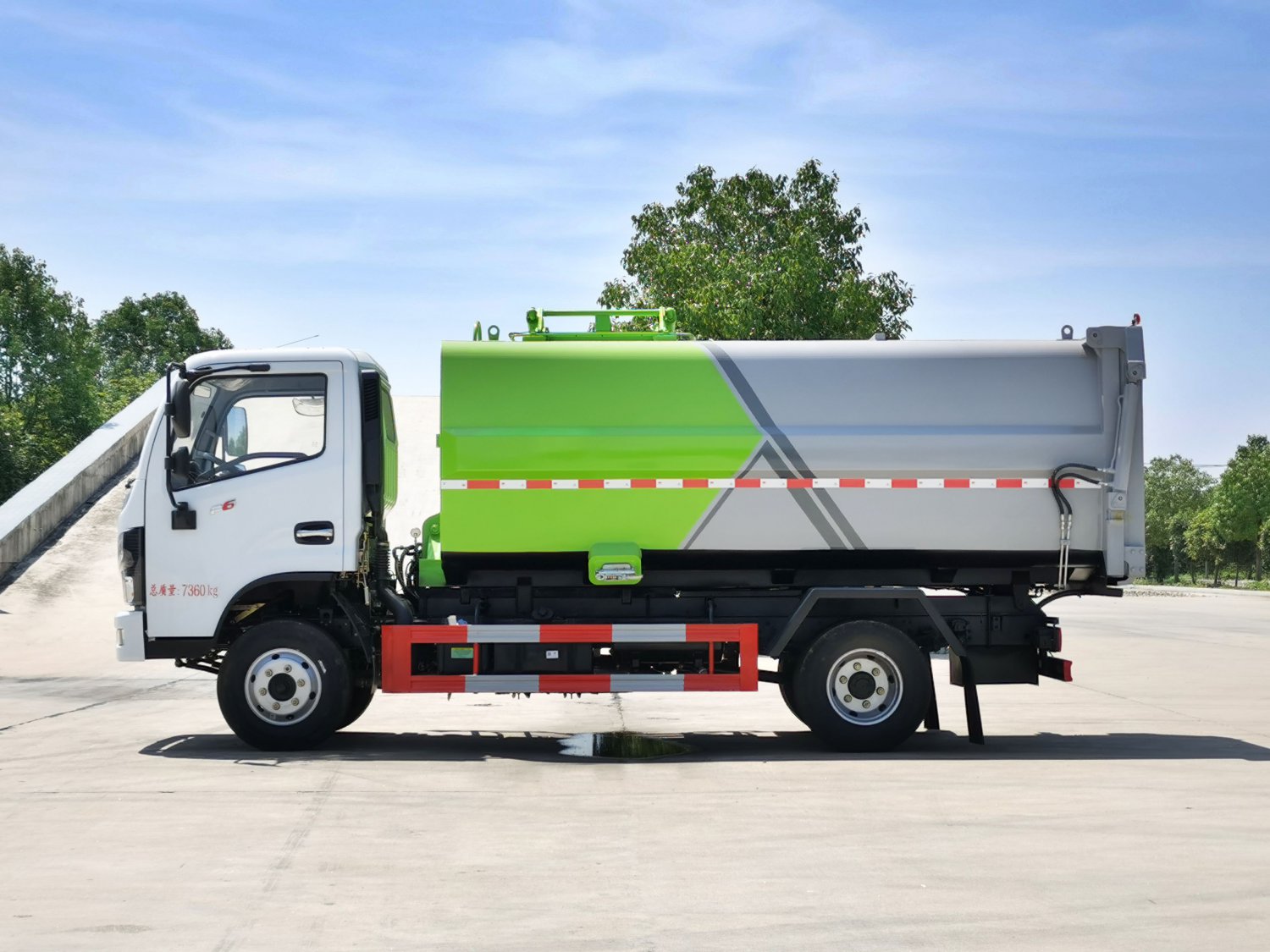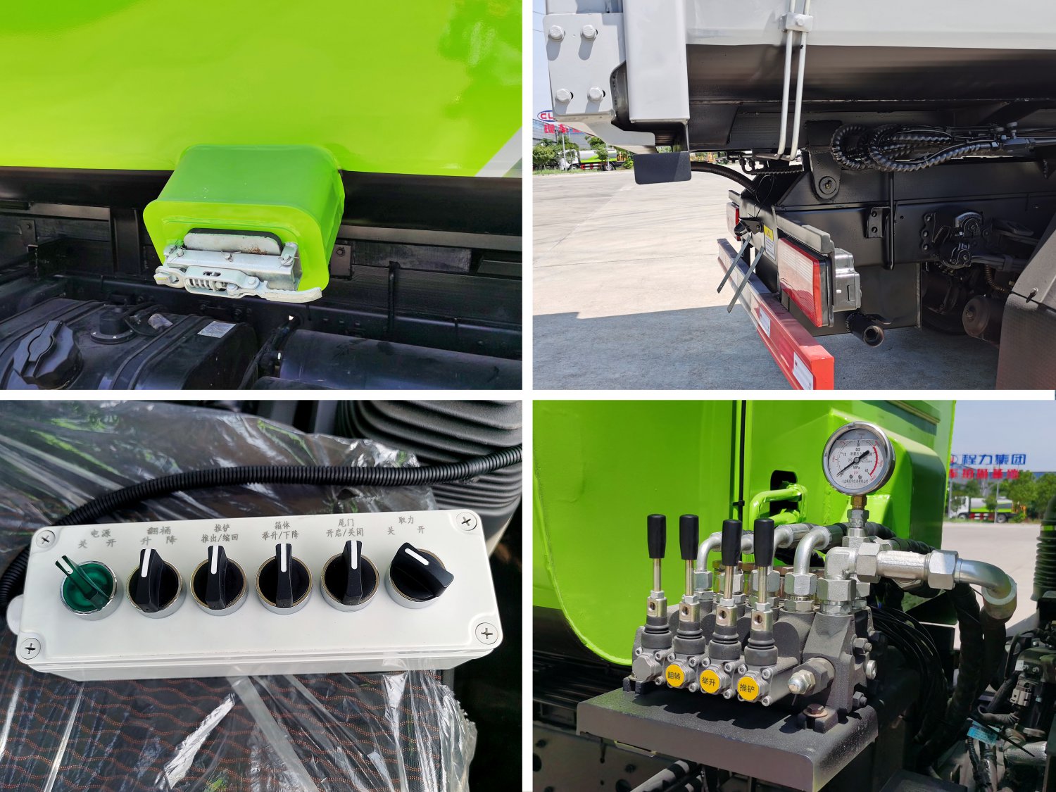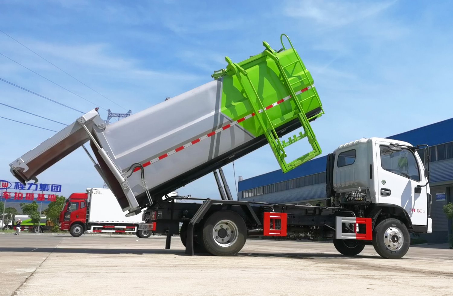 上装配置:新款箱体,美观大气,采用边三底四Q345锰板,箱体为武钢碳钢板材料,箱体内部做防腐防锈处理,弧形耐压箱体带全推装置,后门液压锁紧,整体密封性好,车尾部带厚橡胶密封条带污水收集槽,防污水滴漏,有效容积7.8方,采用江苏中梅多路阀,合肥长源液压泵,电动手动双操控系统,室内外均可操作,箱体侧方带挂桶架翻转上料机构,箱体可按要求喷绘图案和字样。