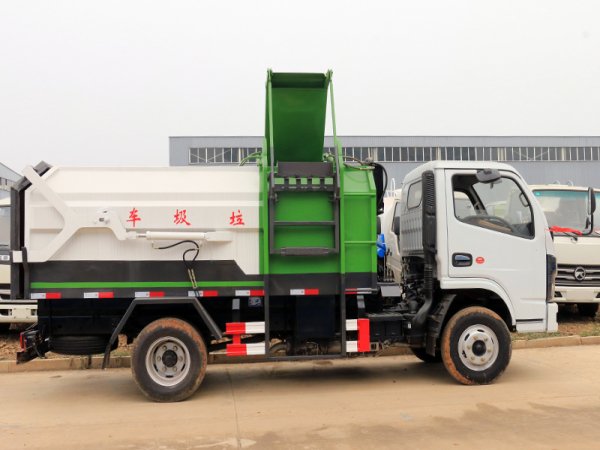 该车箱体有效容积:5立方,箱体前部侧面带有挂桶提升机构,可自动举升垃圾桶倒入垃圾,带自卸功能,尾部装有橡胶密封条,防污水滴漏,杜绝二次污染。挂桶垃圾车可根据客户要求搭配120升或240升塑料桶和铁桶。